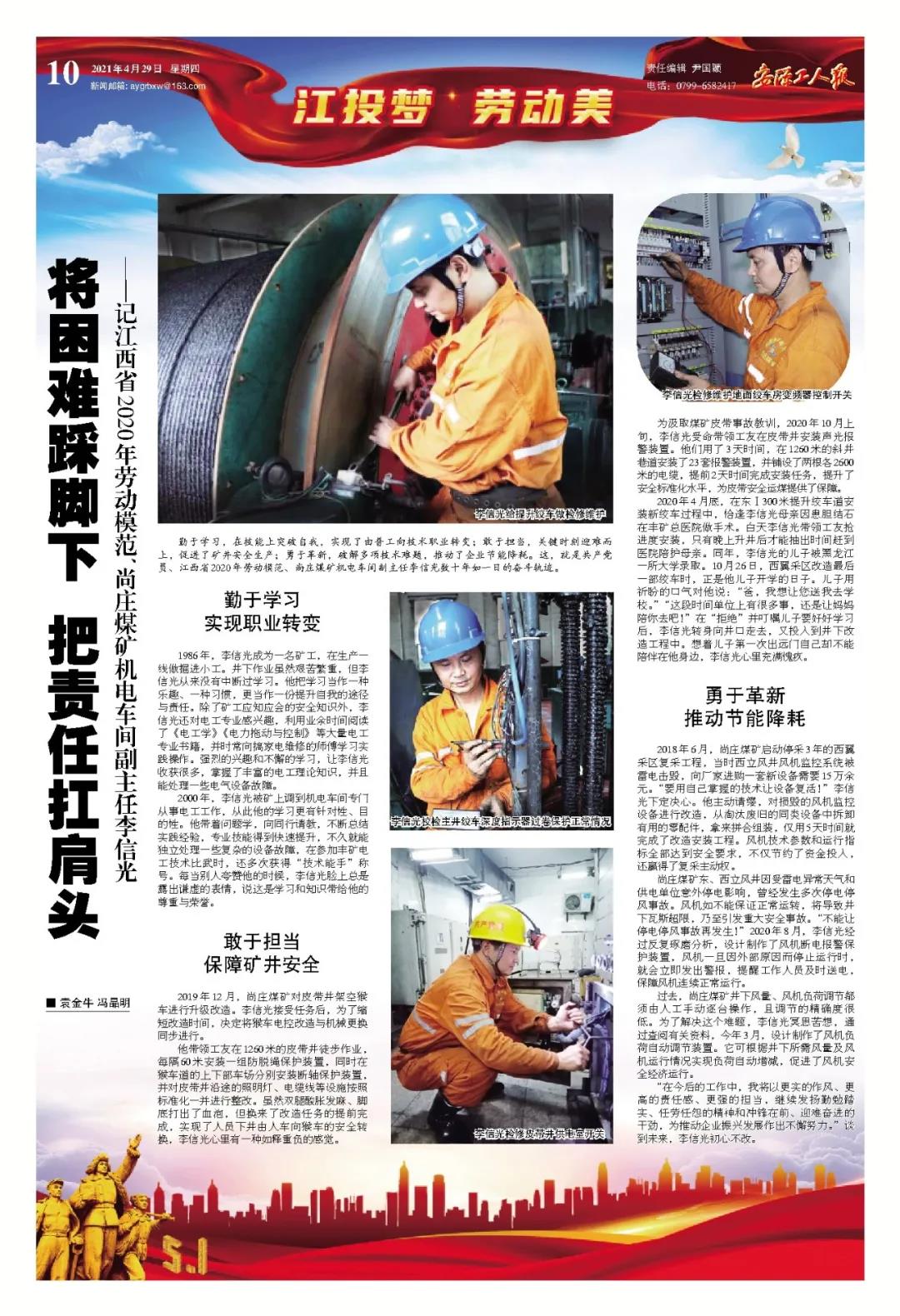 勤于学习,在技能上突破自我,实现了由普工向技术职业转变;敢于担当,关键时刻迎难而上,促进了矿井安全生产;勇于革新,破解多项技术难题,推动了企业节能降耗。这,就是共产党员、江西省2020年劳动模范、尚庄煤矿机电车间副主任李信光数十年如一日的奋斗轨迹。